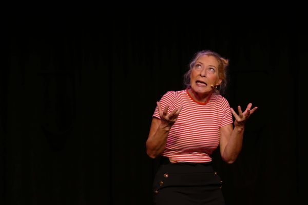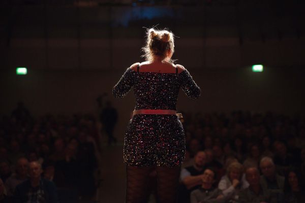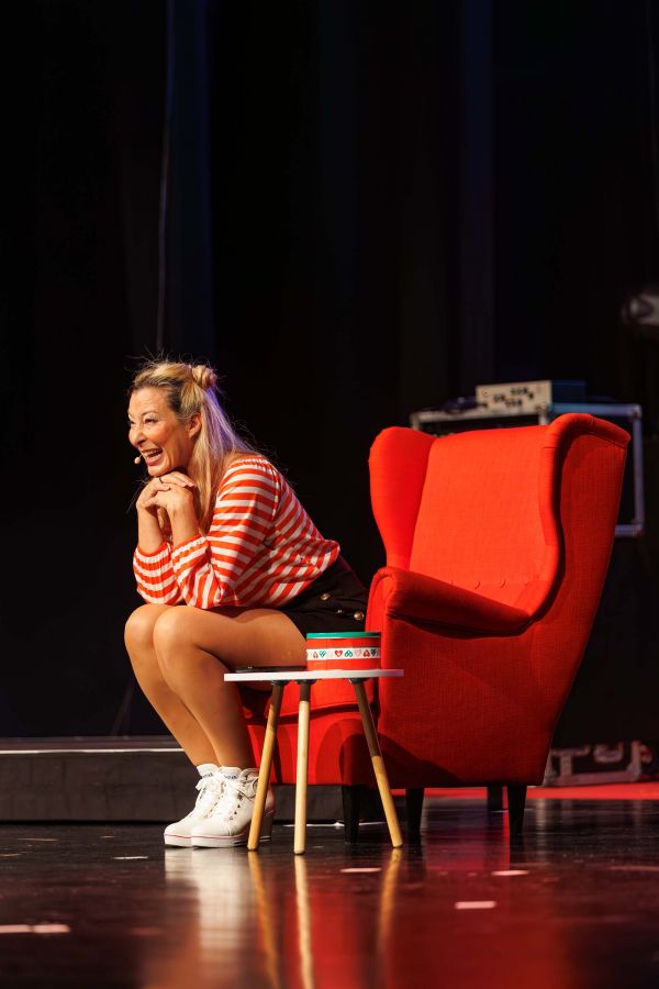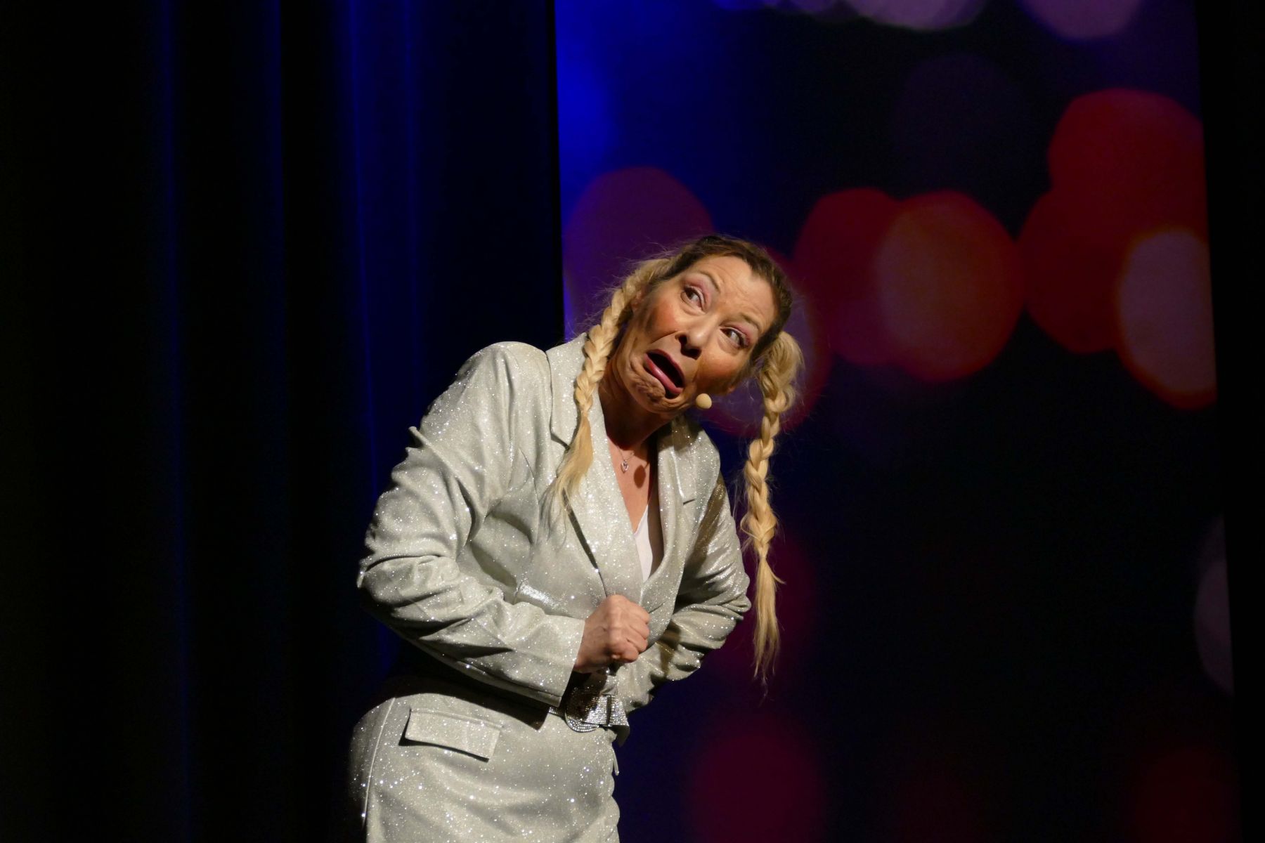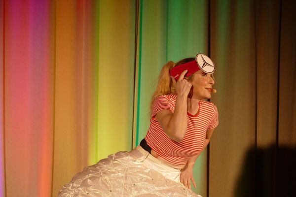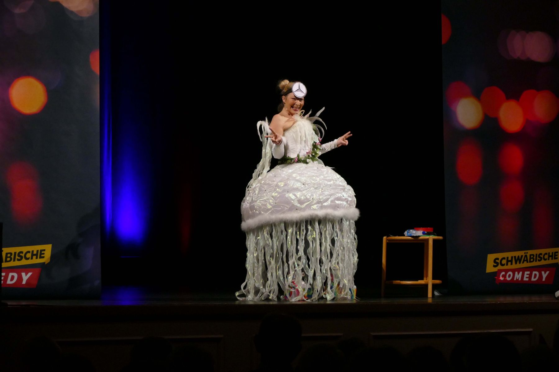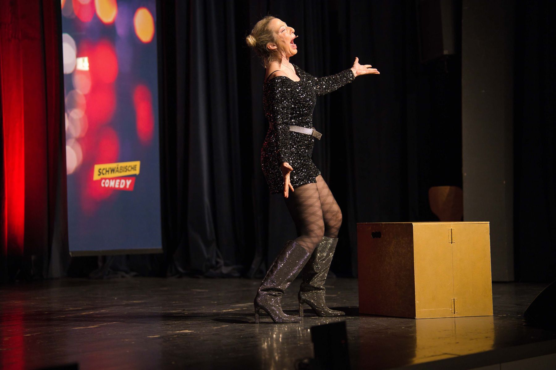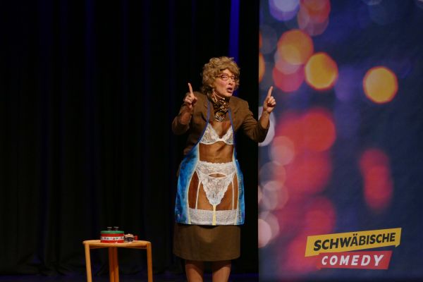 Die Fachfrau für Heimat- und Erotikkunde Christiane Maschajechi eröffnete im ausverkauften Volksbank-Foyer die diesjährigen Mundart-Wochen mit Weisheiten zur »schwäbischen Äroddik«, auch wenn es die gar nicht gibt. Aber bevor's in die heißen Zonen geht, versetzt sie ihr Publikum erst mal noch in Schockstarre, indem sie als muffig-kreischiges Hausfrauen-Wunder durchs Publikum rennt, mit dicker Brille, blond-verstaubter Perücke und mottigem Kostüm. Wo sie unter den Klängen von »Tastenhengst« Alexander Wernick eine Ode auf »schwäbische Drogen« singt: Heffezopf und Zibeeben – »des isch a Stick / schwäbisches Glick«.