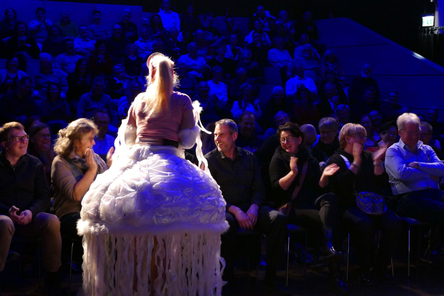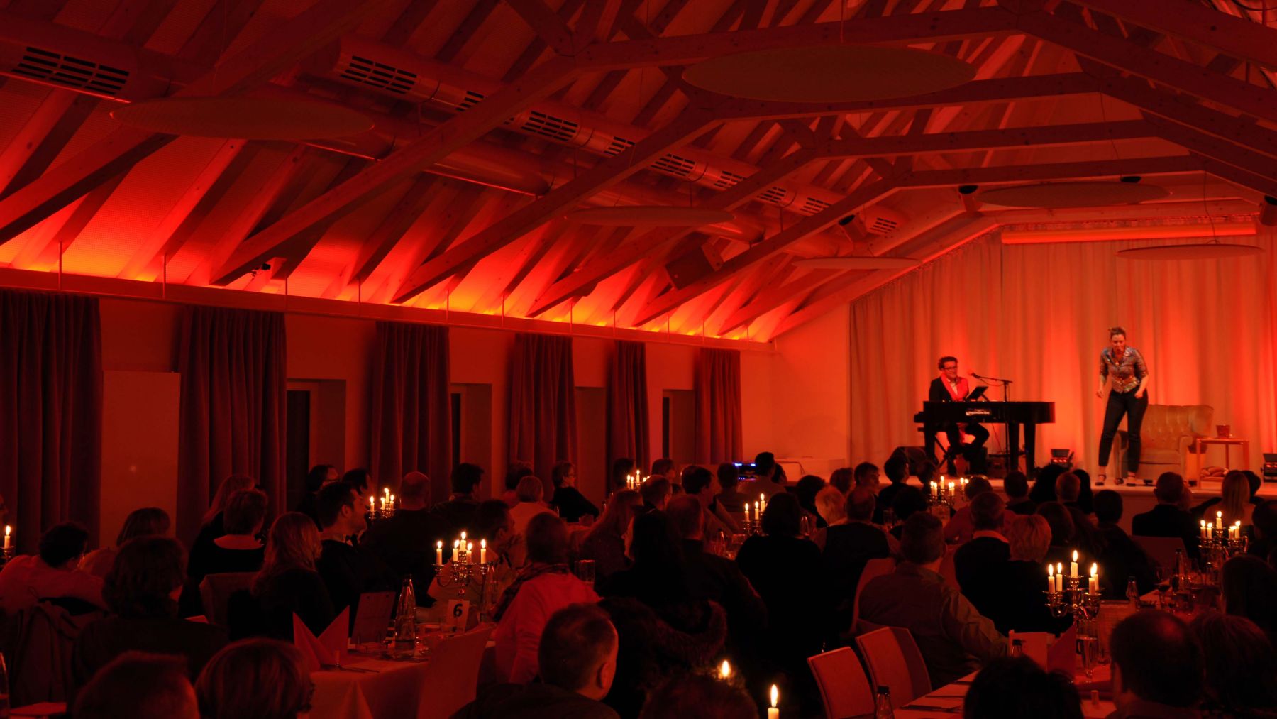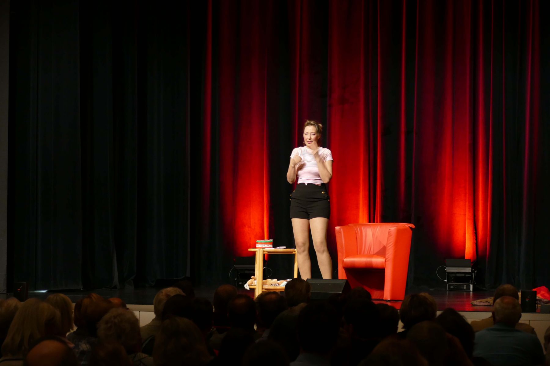 Schlag auf Schlag präsentierte Christiane M. ihre Beiträge. Sie zog sich aus und um, posierte aufreizend auf dem Sofa, trällerte selbst getextete Lieder, scherzte mit dem Publikum, erzählte aus ihrem Leben und gab pausenlos versteckte oder ganz direkte Hinweise, wie Mann und Frau zu einem gelingenden Sexualleben kommen können. Klasse war, dass die studierte und ausgezeichnete Sprachkünstlerin dabei stets die richtigen Worte wählte und niemals obszön wurde. Auch die musikalische Begleitung durch Alexander Wernicke am Klavier war perfekt.