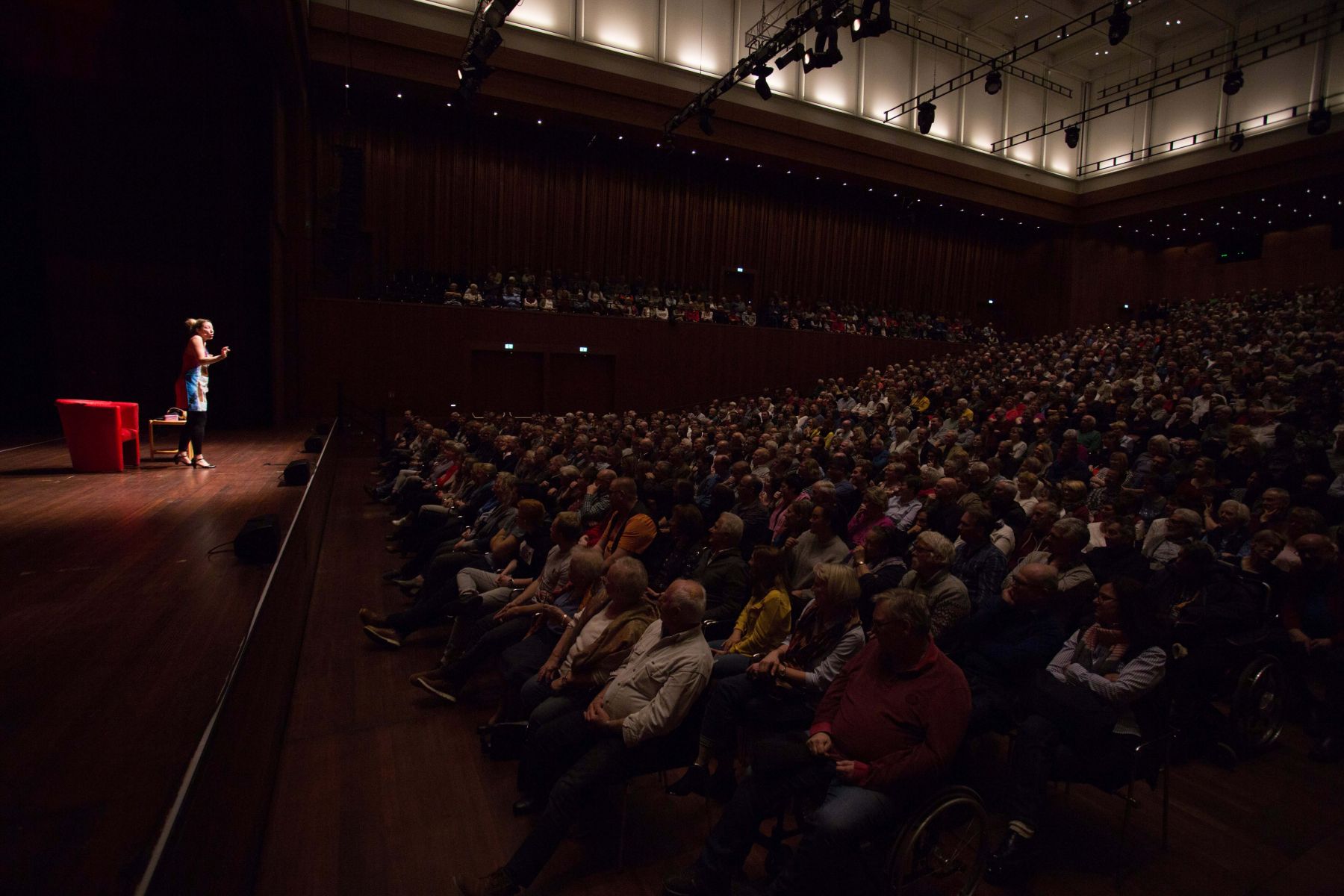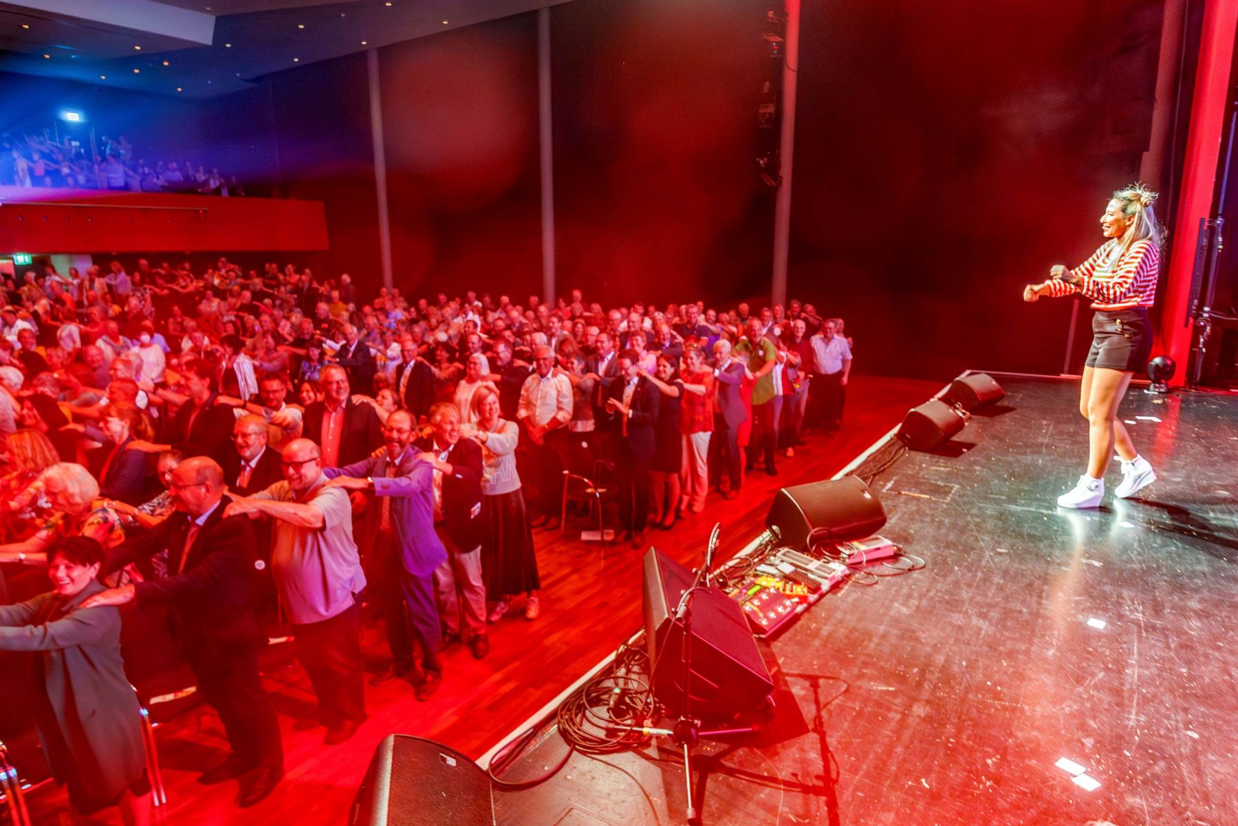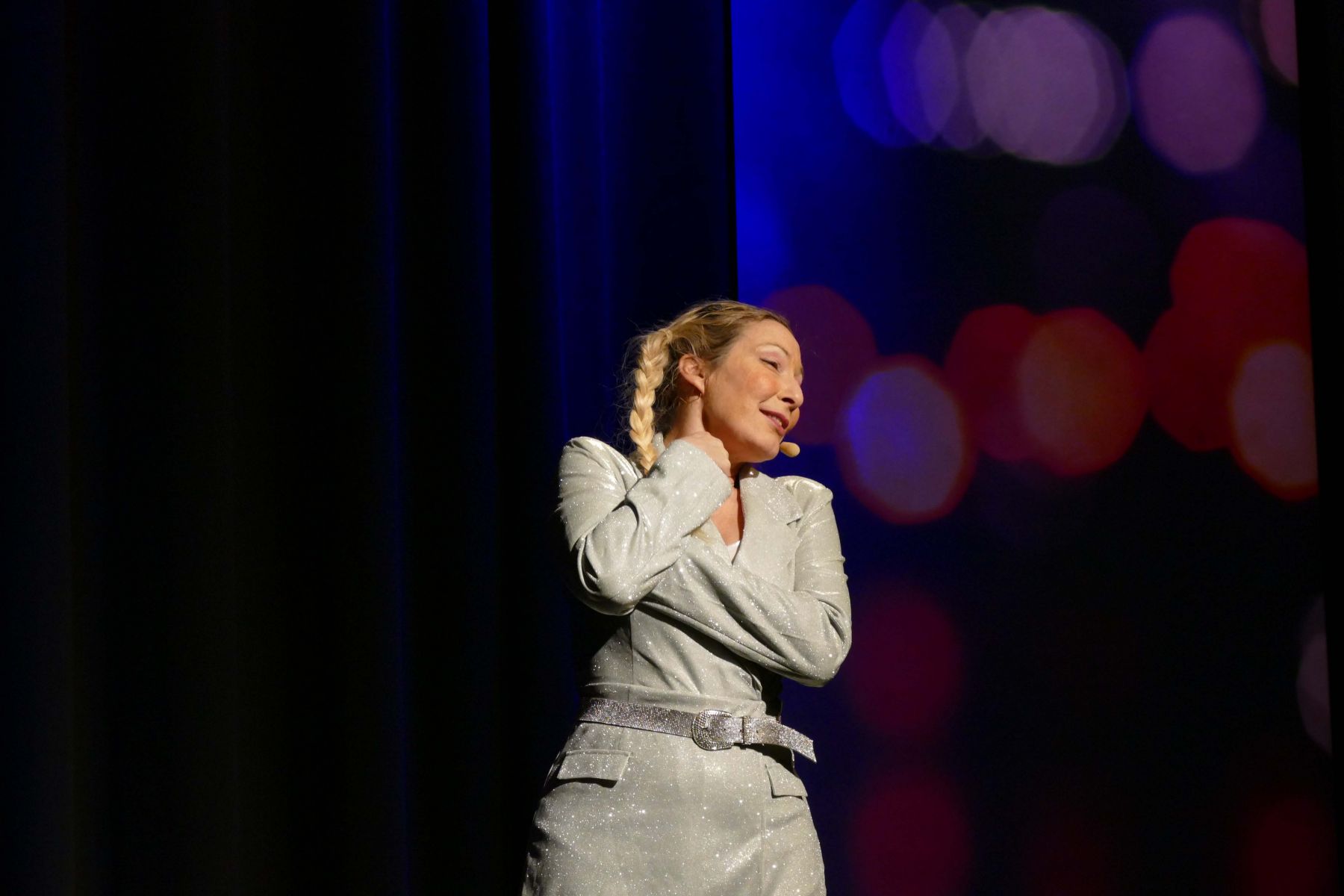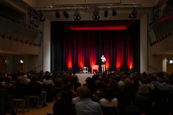 Beide Künstler fesselten das Publikum durch ihr Können und ihre Empathie von Anfang an. Deshalb war es auch nicht verwunderlich, dass sich ausnahmslos alle Anwesenden zu gemeinsamen lustigen Sprach- und Yogaübungen mitreißen ließen. Die Stimmung war grandios, auf und vor der Bühne.