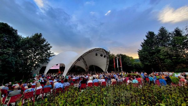 Alles passte, bis zur Abenddämmerung. Da lockte das Bühnenlicht zunehmend mehr Stechmücken auf die Bühne. Und mit diesen blutsaugenden Biestern hatte hauptsächlich Alex am Klavier zu kämpfen. Er war umzingelt von einer ganzen Schnakeninvasion. Immer wieder musste er sein Klavierspiel unterbrechen und komödiantische Tuch-Toreroübungen einbauen. Christiane reagierte prompt und wechselte vom Sofa zum Klavier. Was die beiden dann gemeinsam abzogen, war wahrlich bühnenreif und zeigte deren Improvisationstalent. Ruckzuck konnten beide ihre Mimik, die Gestik, den Gesang und das drumherum auf die neue Stechmücken-Situation einstellen. Das Publikum war begeistert. Vielleicht wird dieser völlig improvisierte Teil des Abends ja künftig als regulärer Programmteil eingebaut.