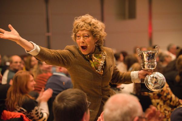 Das lässt Schlimmes befürchten: Bitte nicht noch ein Kehrwochen-Programm mit Schurz-Appeal! Aber zum Glück klettert die Heffezopf-Anbeterin bald auf ihren hässlichen Bühnen-Sessel und legt zu Joe Cockers »You Can Leave Your Hat On« einen mehr oder weniger geschmeidigen Strip hin: »In der Volxbank wird was botte, gell!«. Schuhe und Strümpfe fliegen ins Publikum, die Leistungsträger in den ersten Reihen geraten in Wallung.