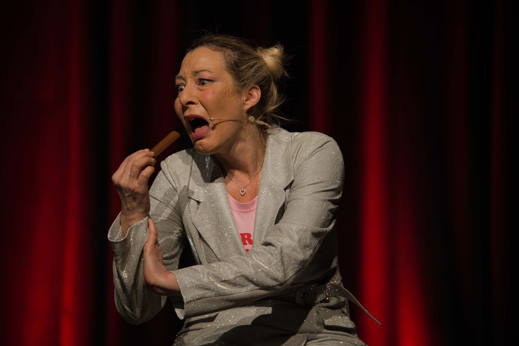 Mit Liebesgeflüster hat es der Schwabe wiederum schon rein sprachlich schwer. »I mog di!« sei super, da könne man notfalls auch einen Rückzieher machen: »Äh, da hasch du mi jetzt glaub falsch verstanden.« Damit niemand mehr was falsch versteht, gibt's fürs Publikum eine Einheit Sprecherziehung mit Korken im Mund: Christiane M. ist in ihrem »seriösen« Leben Nachrichten-Sprecherin beim SWR, kann aber auch wunderherzig singen. Mit ihrem Kompagnon am Flügel betextet sie bekannte Chansons mit neuen Inhalten. Aber bevor sich allzu viel Wohlbefinden im Publikum breitmacht, schnell wieder was Ekliges. Auf dem Sessel »sieht man ja jede Schneckenspur«. Christiane M. kennt halt keinen Schmerz. Und kein Tabu.